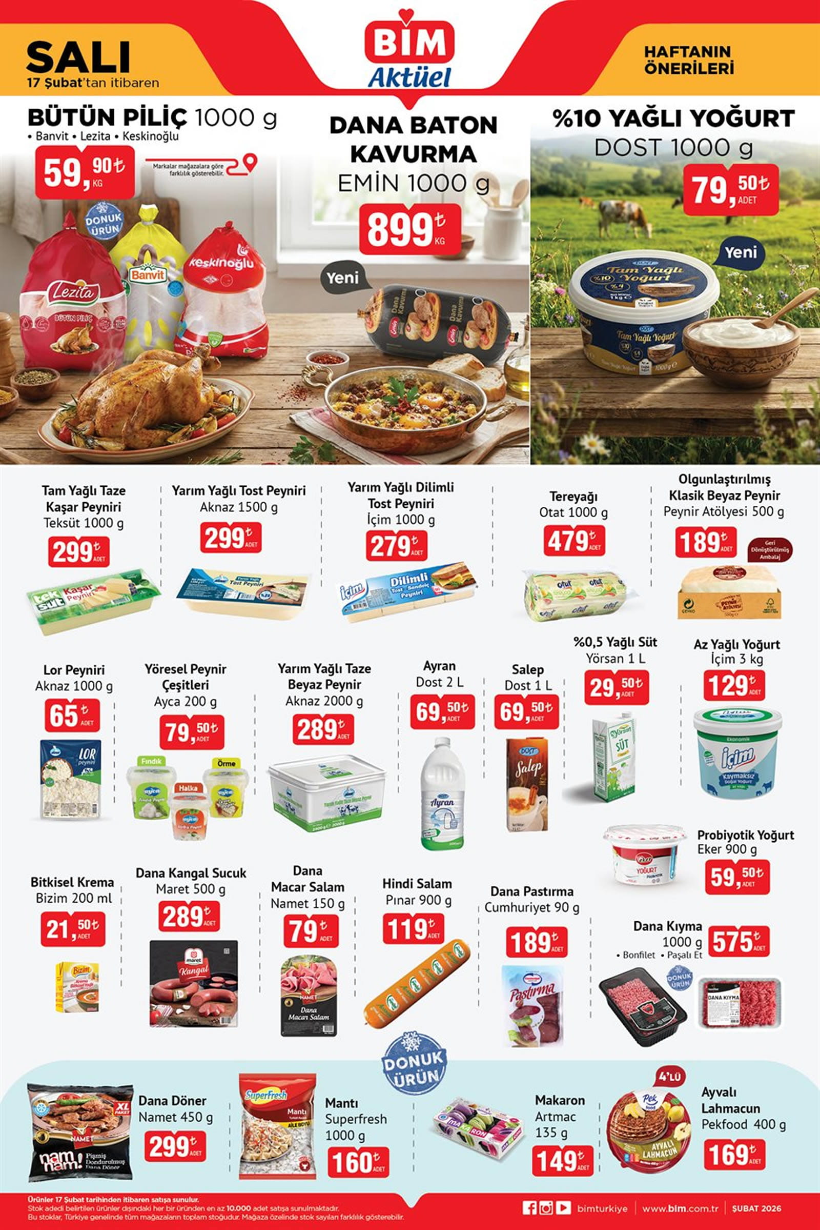 17 Şubat BİM Kataloğu ile Emin Dana Baton Kavurma, Teksüt Tam Yağlı Taze Kaşar Peyniri, Aknaz Yarım Yağlı Tost Peyniri ve Aknaz Yarım Yağlı Taze Beyaz Peynir gibi ürünlerde avantajlı fiyatlar sunuluyor. BİM 17 Şubat 2026 Aktüel Ürünler Kataloğu ile bu hafta gelecek tüm ürünlere sayfanın devamından ulaşabilirsiniz.