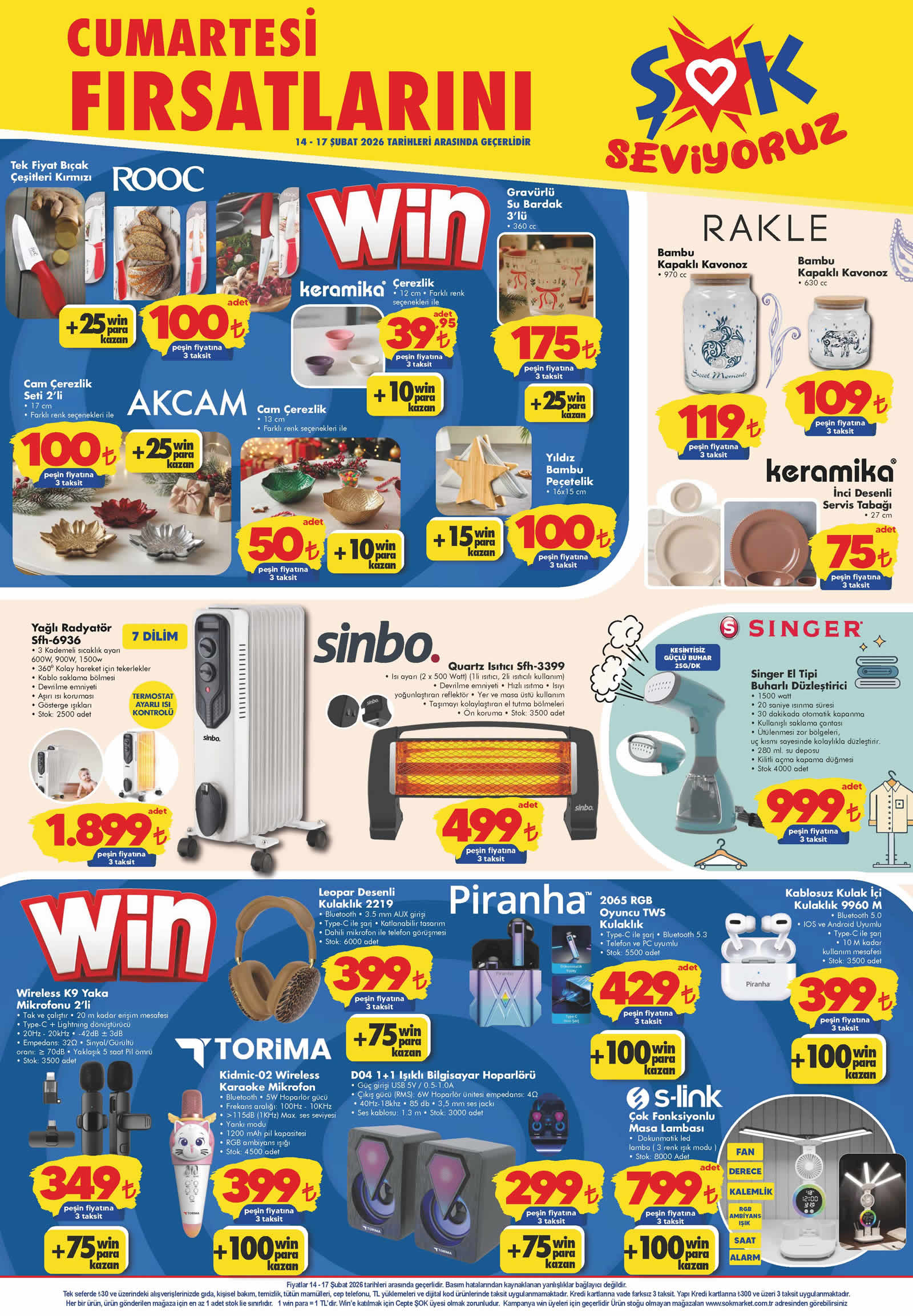 ŞOK Aktüel 14 Şubat kampanyasında Sinbo Yağlı Radyatör 1.899 TL, Sinbo Quartz Isıtıcı 499 TL, Singer El Tipi Buharlı Düzleştirici 999 TL, 2'li Torima Wireless K9 Yaka Mikrofonu 349 TL, Torima Leopar Desenli Kulaklık 399 TL, Piranha TWS Oyuncu Kulaklık 429 TL, Piranha Kablosuz Kulakiçi Kulaklık 399 TL, Torima Wireless Karaoke Mikrofon 399 TL, 1+1 Işıklı Bilgisayar Hoparlörü 299 TL ve S-Link Çok Fonksiyonlu Masa Lambası 799 TL fiyatla karşımıza çıkıyor.