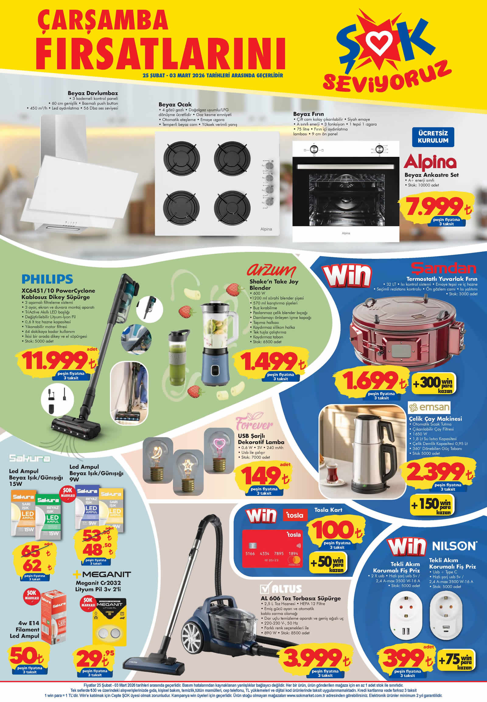ŞOK Aktüel 25 Şubat kampanyasında Alpina Beyaz Ankastre Set 7.999 TL, Philips Power Cyclone Kablosuz Dik Süpürge 11.999 TL, Arzum Shake'n Take Joy Blender 1.499 TL, Şamdan Termostatlı Yuvarlak Fırın 1.699 TL, Forever USB Şarjlı Dekoratif Lamba 149 TL, Emsan Çelik Çay Makinesi 2.399 TL, Altus Toz Torbasız Süpürge 3.999 TL ve Nilson Tekli Akım Korumalı Fiş Priz 399 TL fiyatla ilk dikkat çeken aktüel ürünler oluyor. ŞOK 25 Şubat 2026 kataloğu ile bu hafta gelecek diğer aktüel ürünlere de hızlıca bakalım.